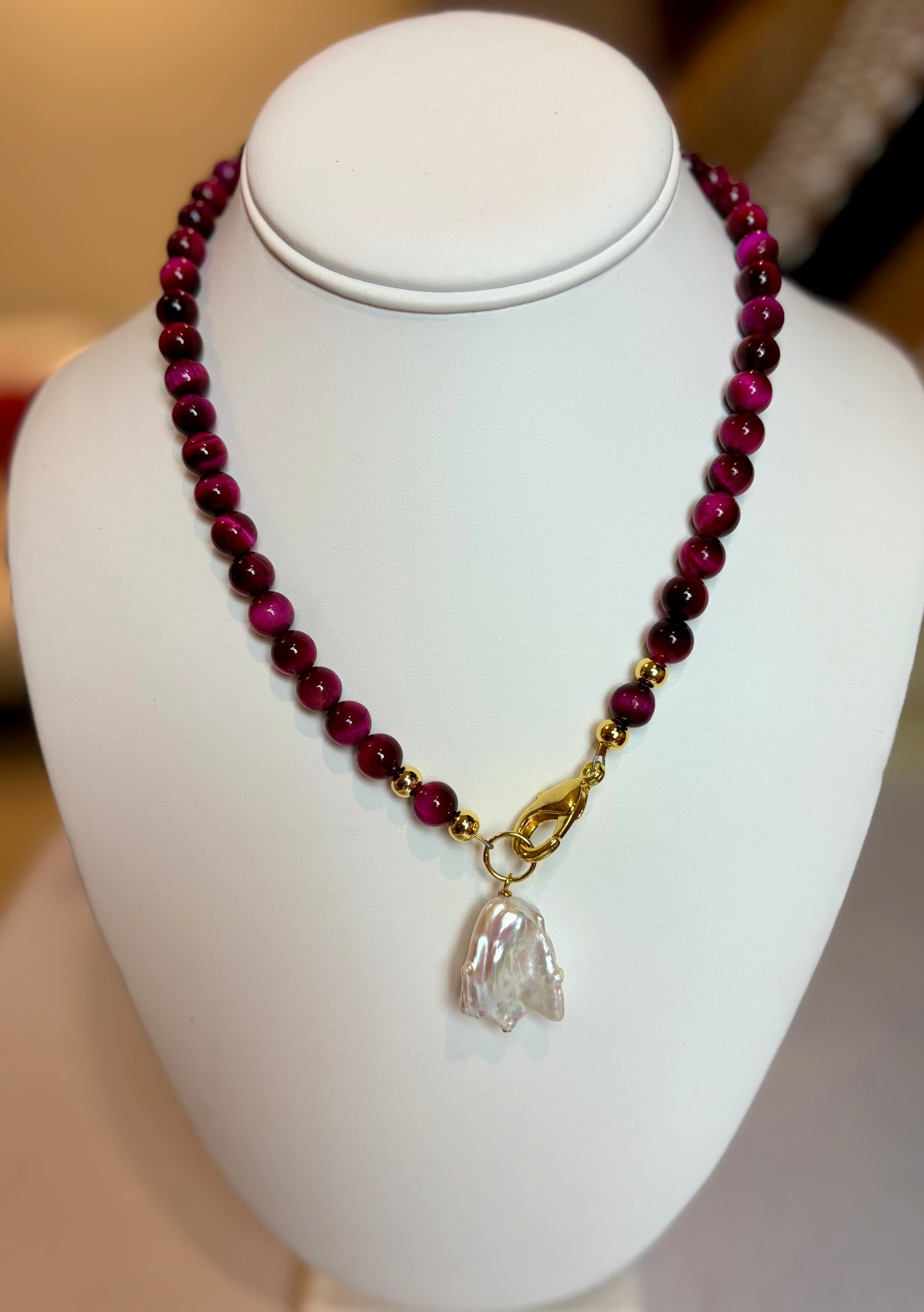 Magenta tiger's eye with large pearl centerpiece, gold plated toggle, 18"