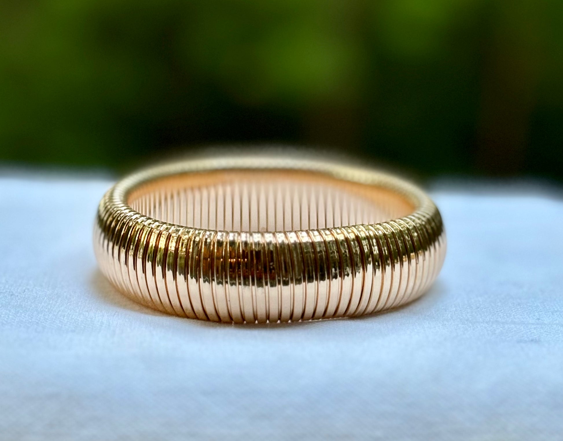 Introducing the Omega 20mm Gold Tone Stretch Bracelet! This quirky and playful accessory features a unique 20mm omega design in a stunning gold tone, making it stretchy and comfortable to wear. Perfect for adding a touch of fun and style to any outfit. (Stretch your style with this gold tone bracelet. A must-have for any fashion-forward individual.)