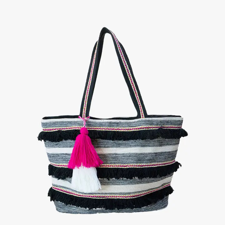 Introducing the Taisha Striped Tassel Tote, a chic and versatile addition to your accessory collection. Crafted from woven cotton, this tote boasts a captivating striped pattern accented with frayed trim, exuding a relaxed yet sophisticated vibe. The standout feature of the Taisha tote is its large double tassel, adding a touch of playful elegance to its design. Inside, you'll find a lined interior with slip and zip pockets, offering ample space to keep your essentials organized on the go.
