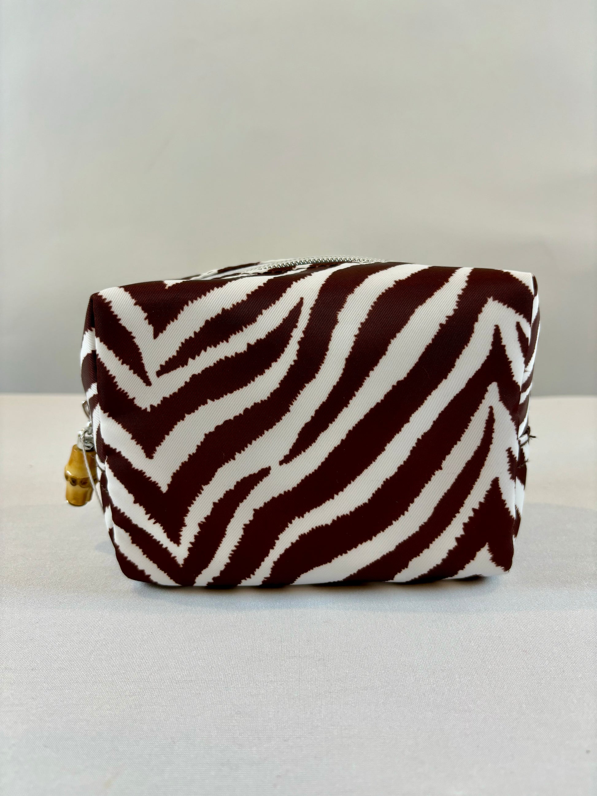 This Travel Mini On Board Bag is slightly smaller, perfect for storing hair accessories, lotions, and makeup. The exquisite natural bamboo pulls add a touch of elegance, and it can easily be cleaned with a damp cloth. Measuring 6"l x 3.5"d x 4.5"h, it's the ideal size for on-the-go luxury.